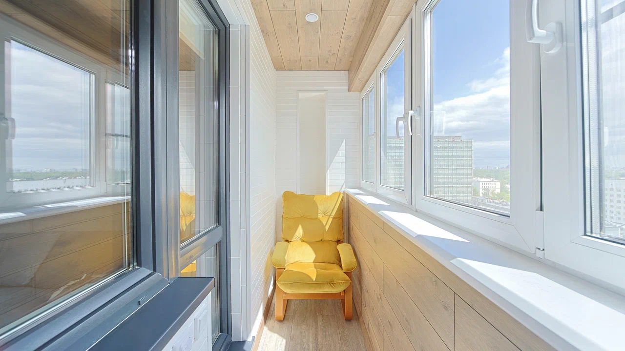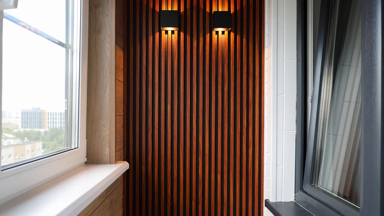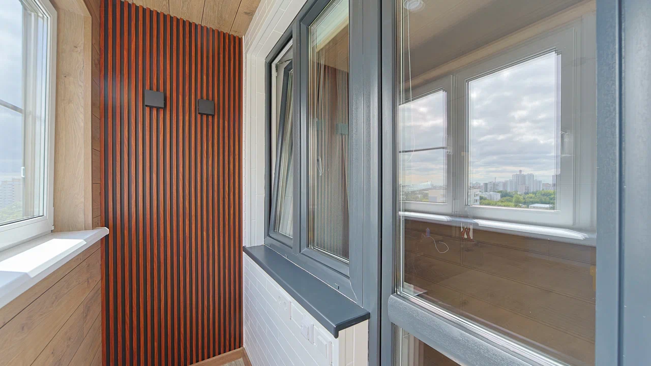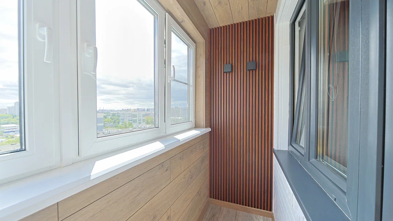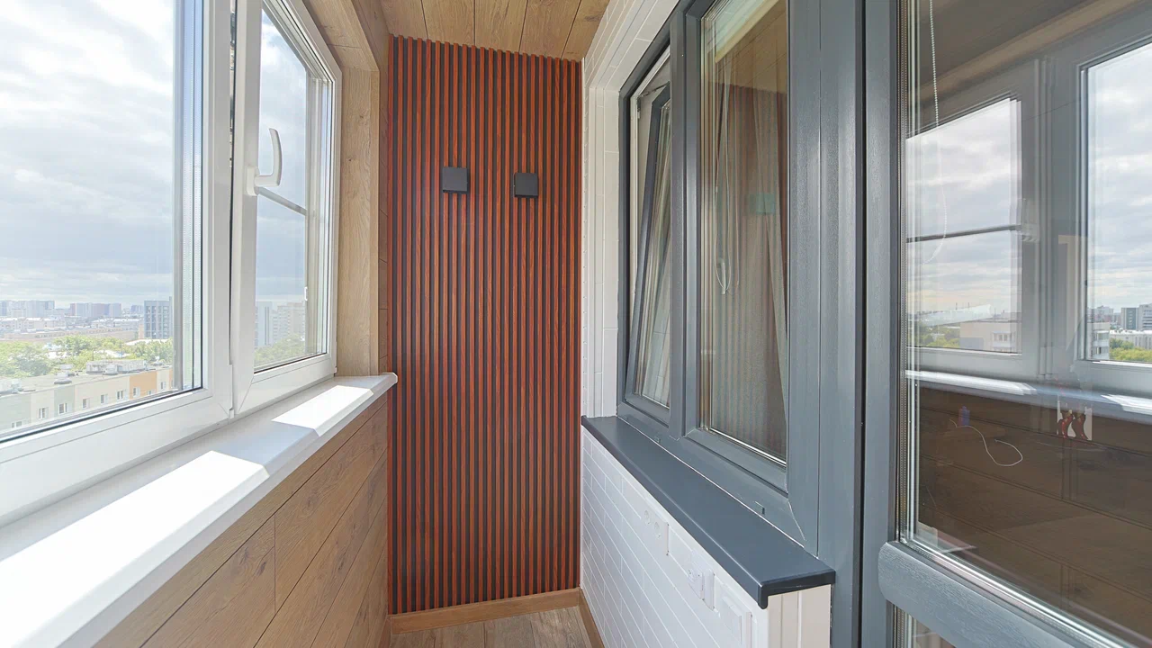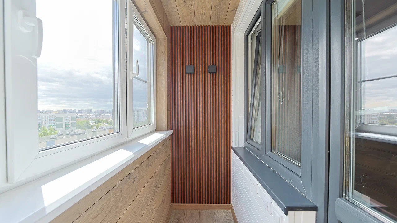 Установлено несколько видов освещения.Сроки: 1 день-демонта/монтаж окон, 5 дней - обшивка балкона.