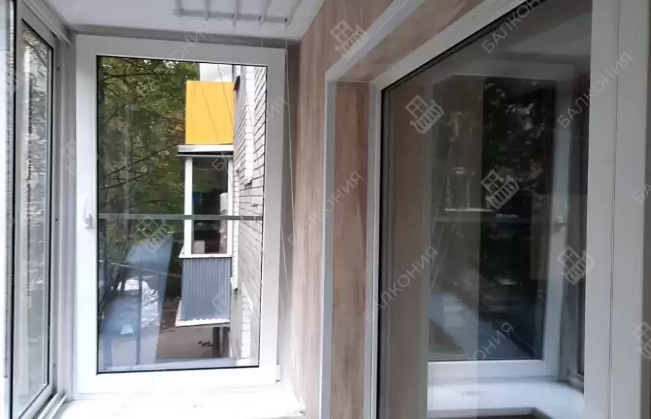 Реализованы работы по отделке п-образного балкона под ключ, в многоквартирном доме серии п-44. Сделано холодное остекление балкона, установлен балконный блок из профиля Rehau GRAZIO 70. Отделка пола выполнена ламинатом, стены и потолок панели ПВХ. Установлена потолочная сушилка белья. Материал предоставлялся компанией «Балкония» согласно пожеланиям заказчика.