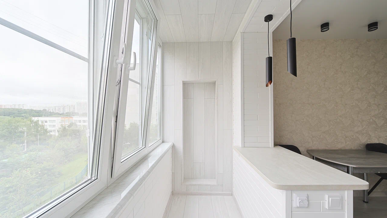 Выведено и разведено электричество. Установлена столешница. Сроки: 1 день-демонта/монтаж окон, 5 дней - обшивка балкона.