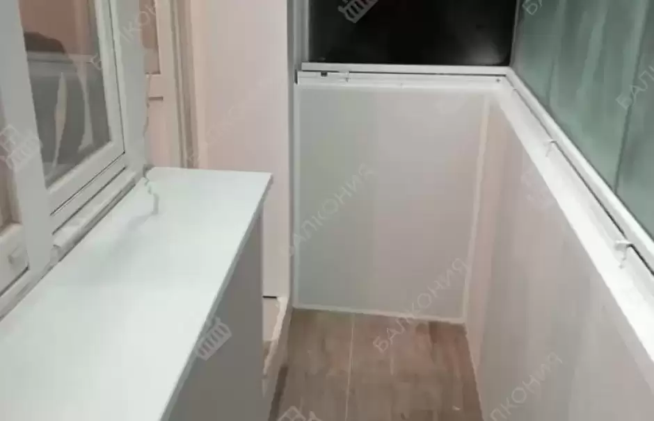 Сделано: отделка стен и потолка выполнена ПВХ панелями, пол — ламинат. Материал предоставлялся компанией «Балкония» согласно пожеланиям заказчика.