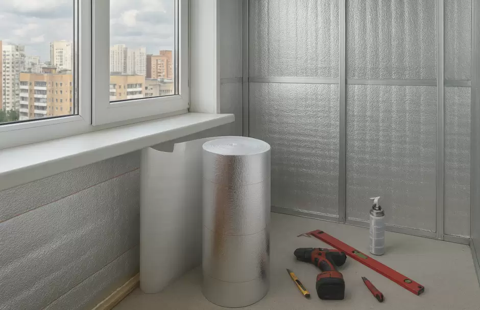 Данной лоджии требовалось небольшое утепление стен. Для этого выбран фольгированный пенофол. Работы выполнены за 1 день: